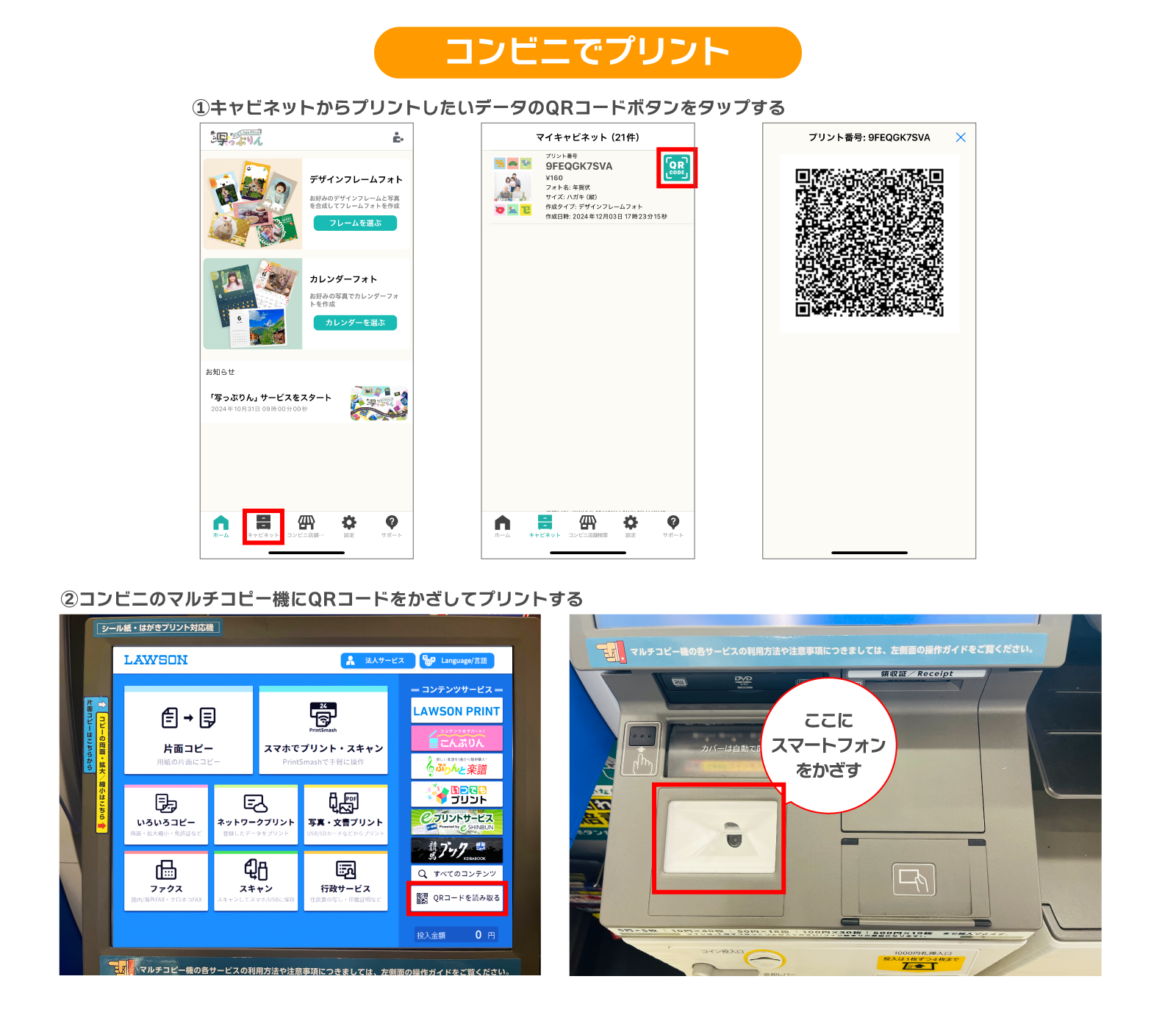 作ったコンテンツは、コンビニ(ローソン・FamilyMart・ミニストップ)のマルチコピー機で印刷が可能です。