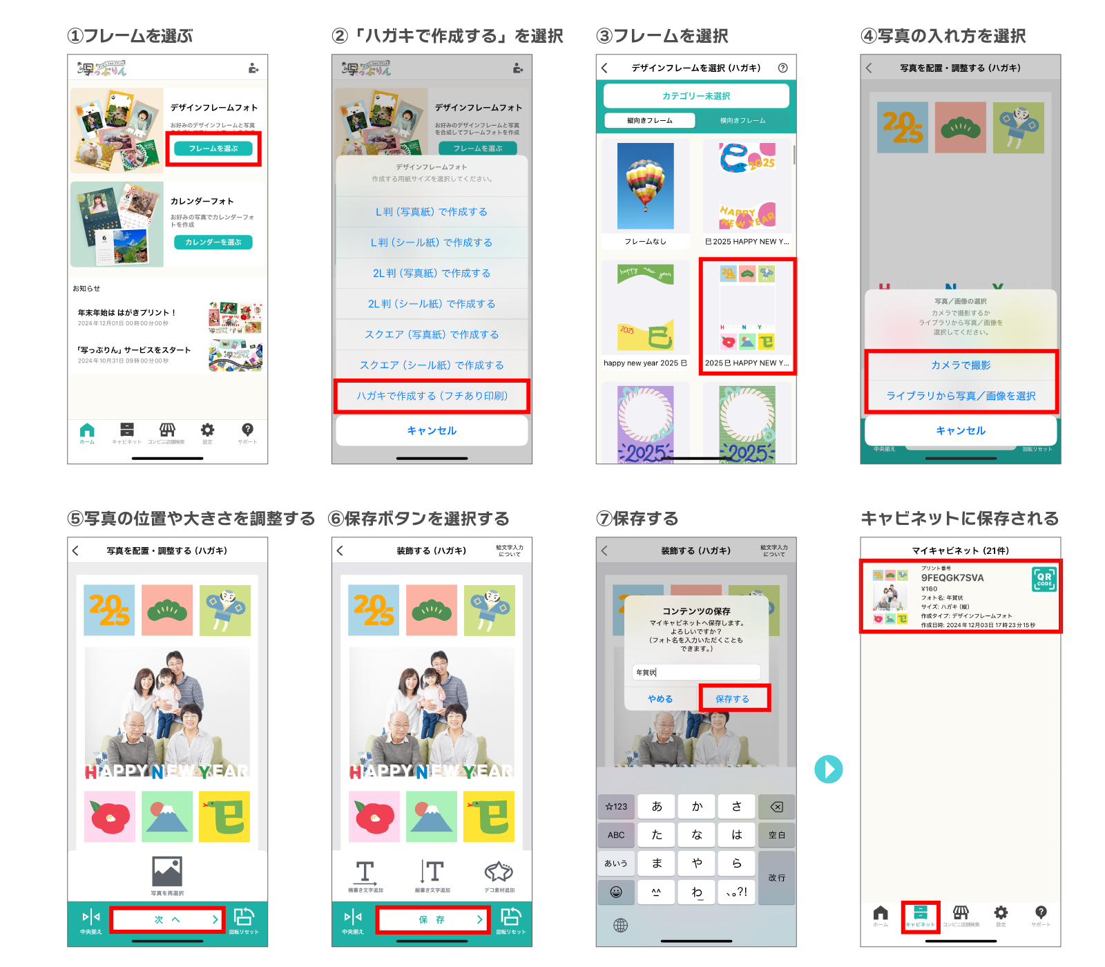 それぞれの「フレームを選ぶ」ボタンをタップし、「ハガキで作成する(フチあり印刷)」を選びます。
