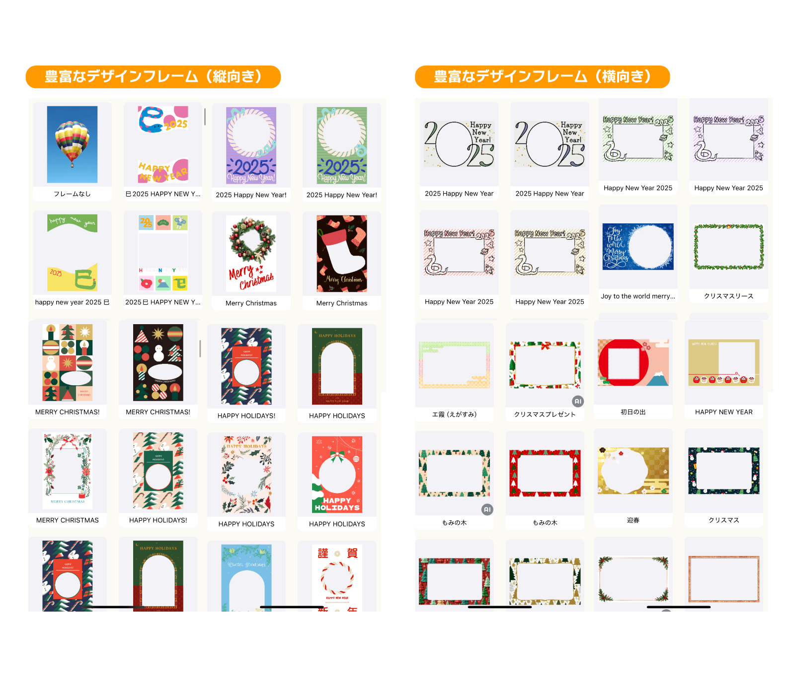 デザインフレームフォトは、年賀状やクリスマスカード、ハロウィンなど、季節を感じるハガキならではのフレームが多数あります☺︎
