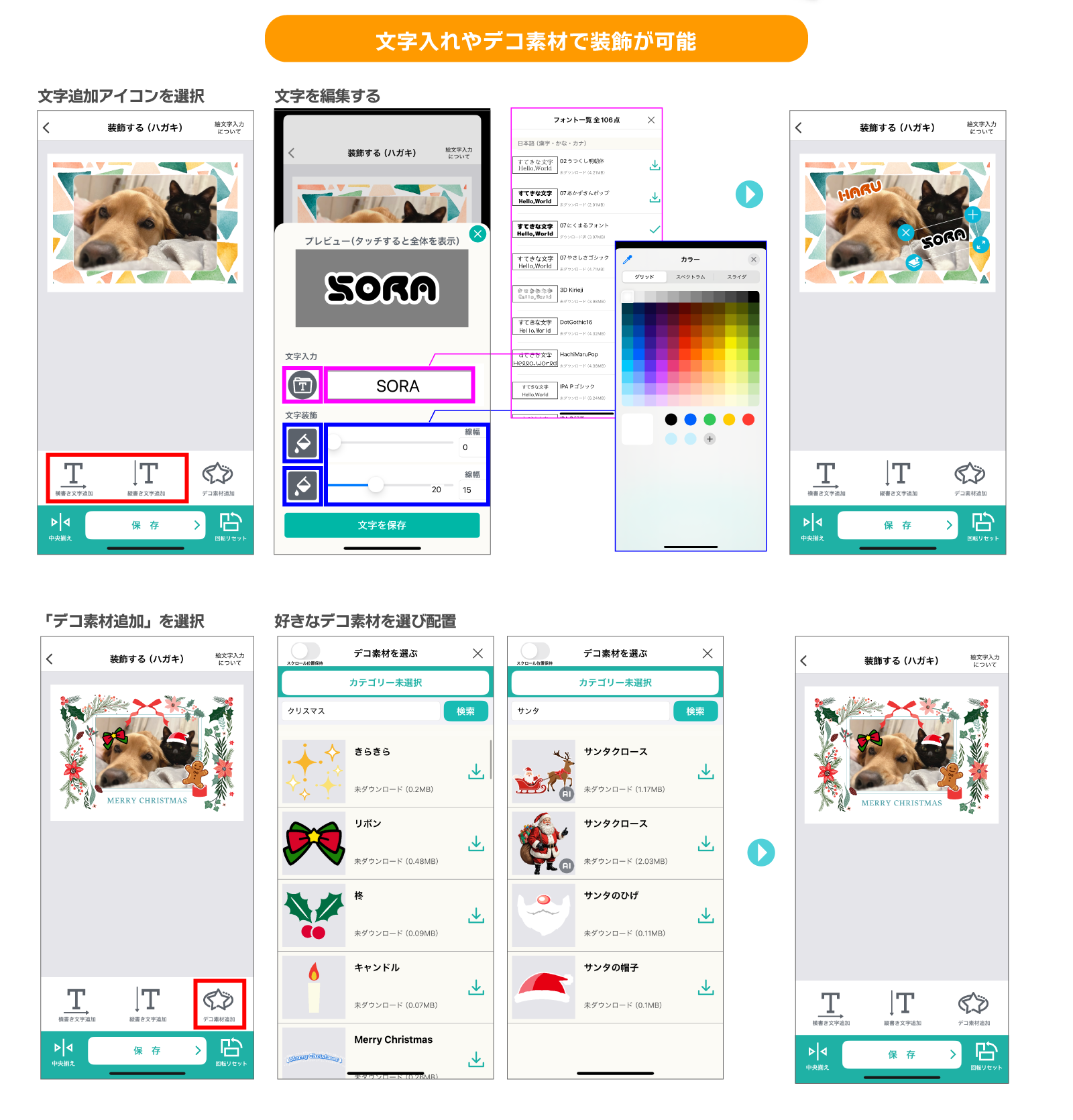 そして、保存の前に文字入れやデコ素材で装飾も可能です。