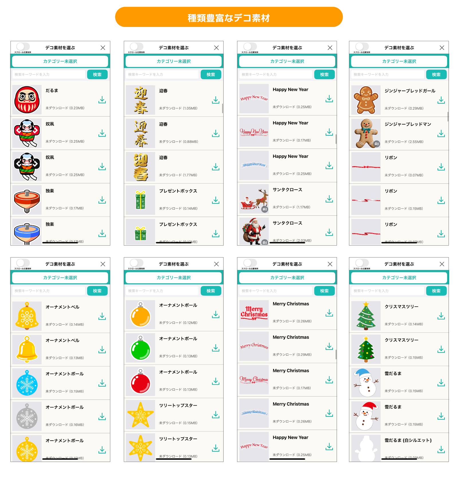 特にデコ素材は年賀状やクリスマスに使える、季節感のある素材が多数あります。