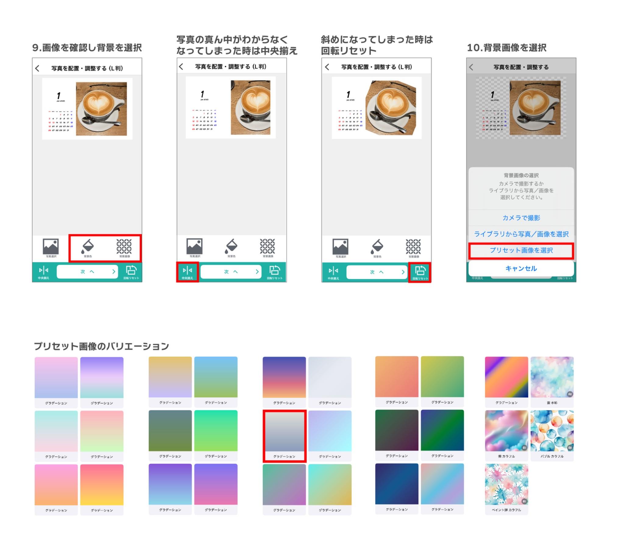 背景画像もスマートフォンに入っている写真を入れることができますが、今回は「プリセット画像を選択」し背景画像を選択します。