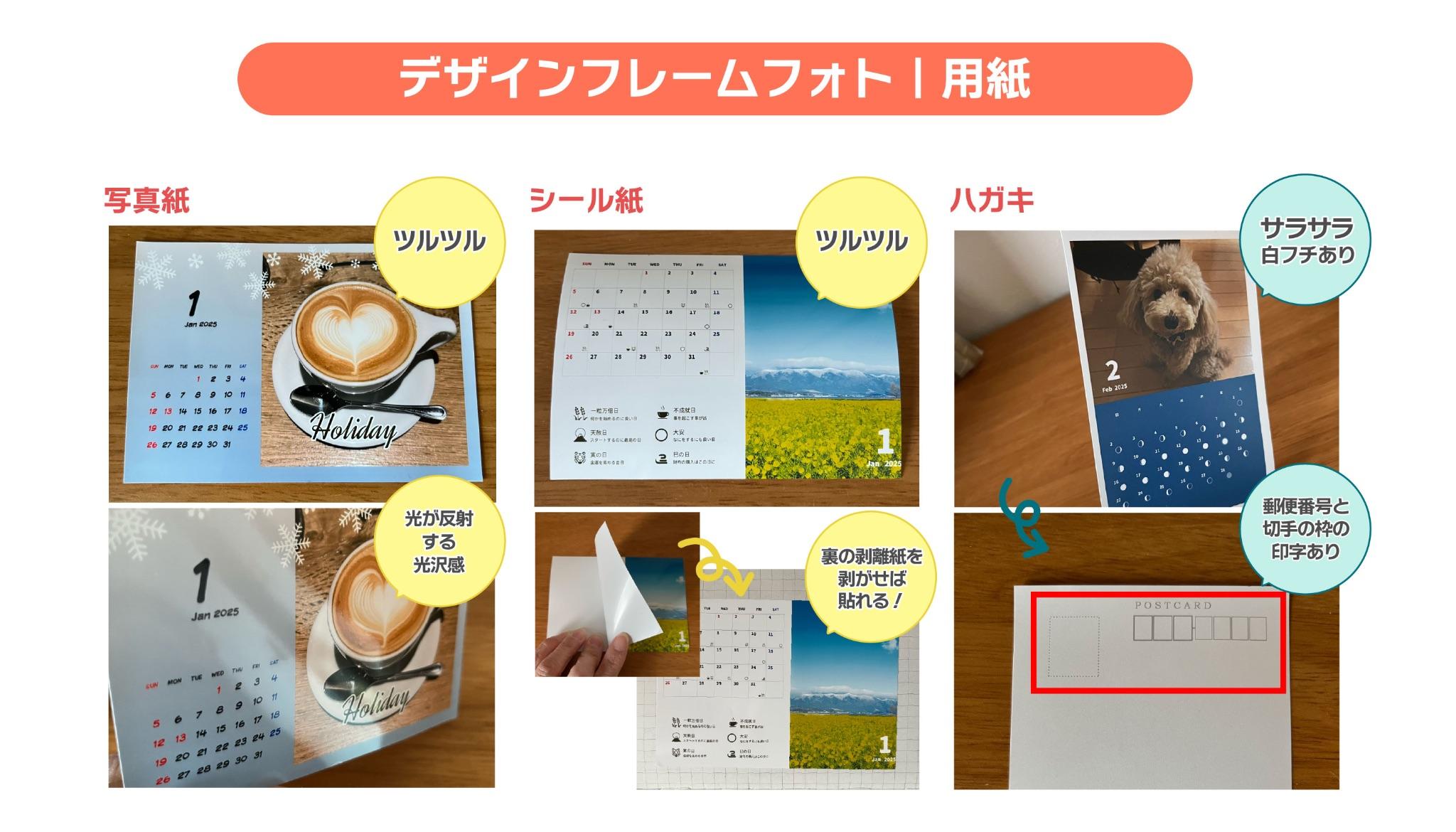 L判/2L判/スクエアサイズは、〈写真紙〉と〈シール紙〉のいずれかを選ぶことができます。(※ハガキは〈はがき用紙〉のみ)