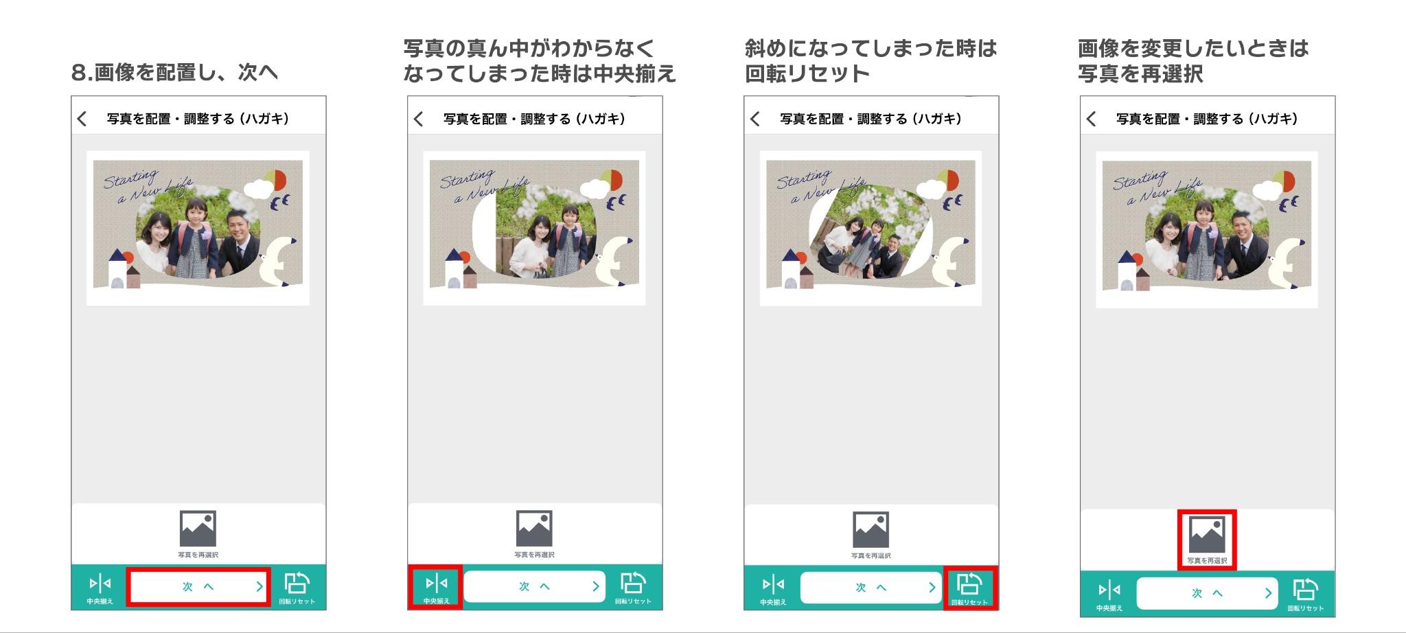 ちなみに写真を入れる際、写真の真ん中がわからなくなったら「中央揃え」、斜めになってしまったら「回転リセット」ボタンでキレイに配置が直ります。