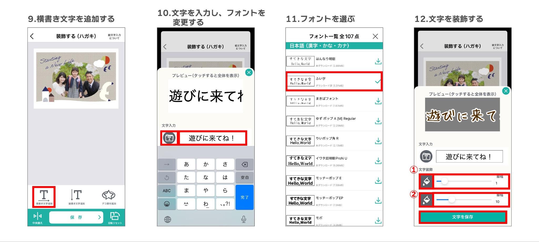 次に一言メッセージを入れたいので「横書き文字追加」から、文字枠をタップして文字入力をします。