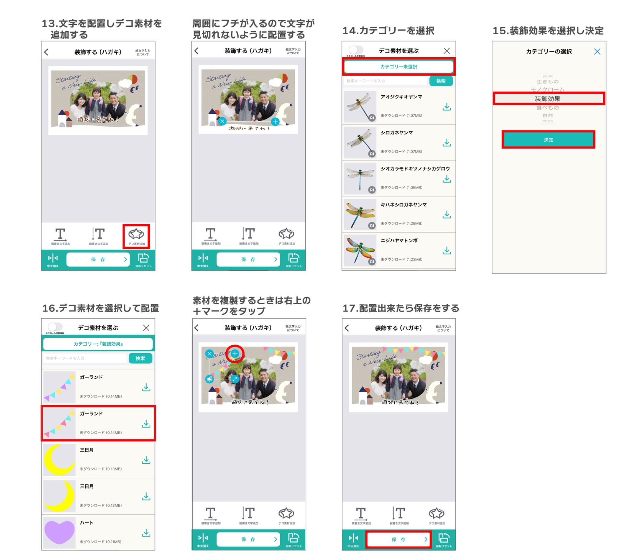 続いてデコ素材を配置していきます。(デコ素材を配置しない方はそのまま「保存」ボタンで保存してください。)